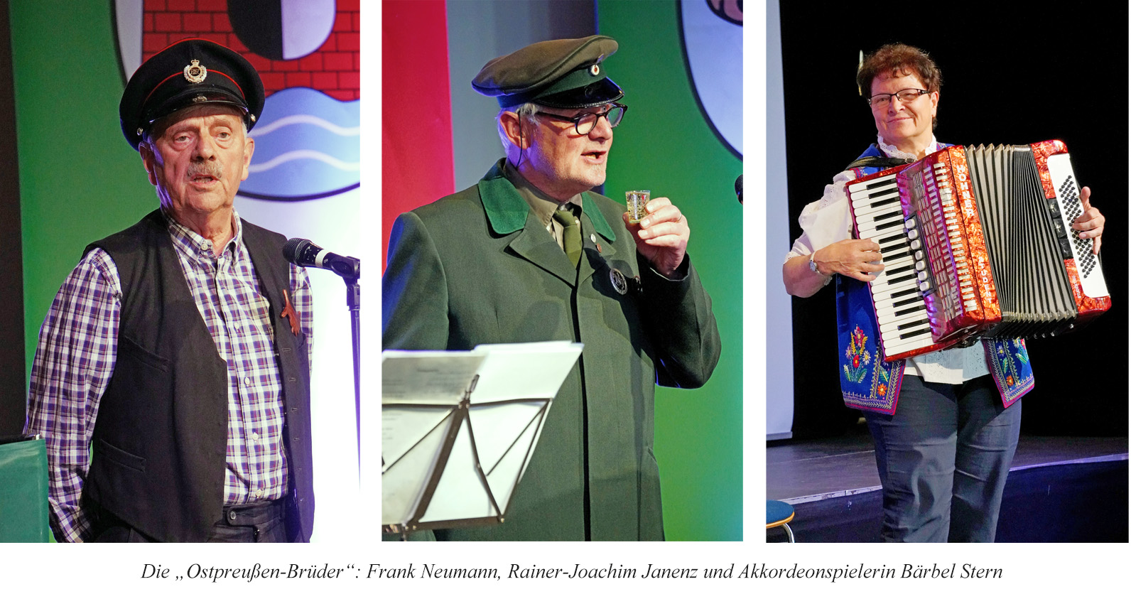 Für ausgelassene Stimmung am Nachmittag sorgten die „Ostpreußen-Brüder“ aus Mecklenburg-Vorpommern, mit Akkordeon begleitet von ihrem „Marjellchen“ Bärbel Stern und einem ganzen Koffer voll guter Laune. Rainer-Joachim Janenz erschien als „Reitbursche Otto Kaluweit aus Trakehnen“, hochgearbeitet zum „1. Deckoffizier vom Hauptgestüt“, während Frank Neumann als „Schrankenwärter Gustav Kaludrichkeit“ auftrat, geboren 1943 in Pillau, mit familiären Wurzeln in Tilsit. In breiter ostpreußischer Mundart schabberten die beiden Gedichte, Witze, Anekdoten, dazwischen Akkordeonklänge und Lieder, bei denen keiner lange stillsitzen konnte. Schnell wurde gelacht, geklatscht und mitgesungen.