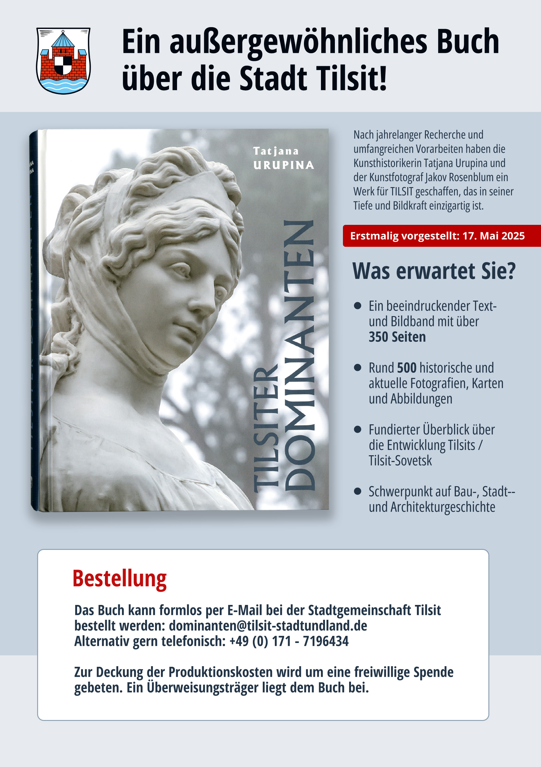| Einige unserer früheren Broschüren und Bücher sind leider vergriffen und stehen uns nur noch als PDF-Dateien sowie in wenigen Belegexemplaren zur Verfügung. Aus diesem Grund können wir nicht alle ehemaligen Publikationen der Stadtgemeinschaft Tilsit e.V. nach Bestelleingang liefern. Vergriffene Bücher und Hefte finden Sie jedoch vielfach noch über gängige Online-Plattformen und Antiquariate. |